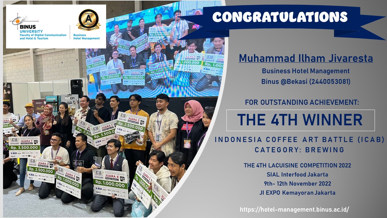 Mahasiswa Business Hotel Management BINUS@Bekasi Muhammad Ilham Jivaresta (2440053081) berhasil meraih JUARA 4 pada Kategori BREWING di ajang INDONESIA COFFEE ART BATTLE (ICAB) 2022 yang menjadi bagian dalam SIAL InterFOOD 2022 yang berlangsung di JI Expo Kemayoran pada 9- 12 November 2022.