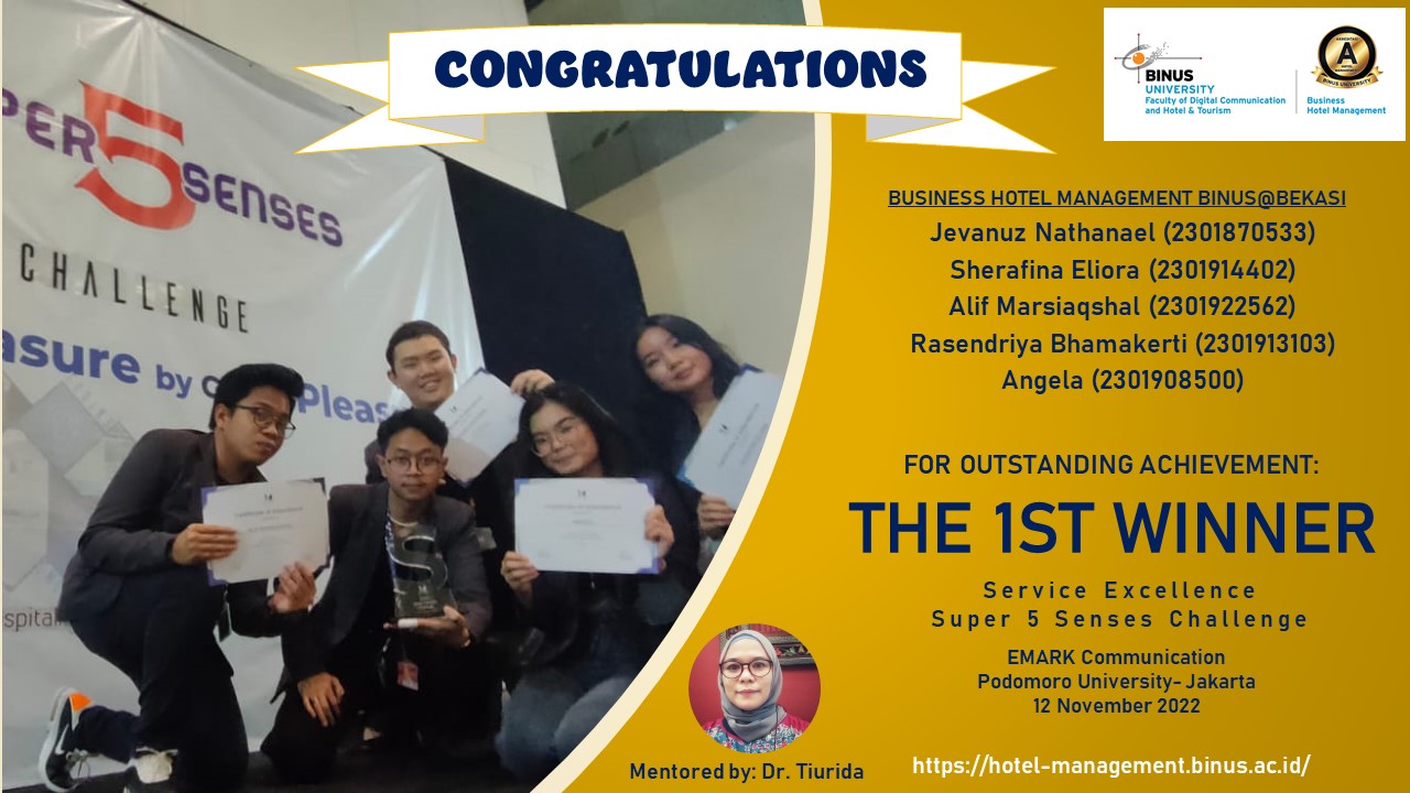 Mahasiswa Business Hotel Management BINUS@Bekasi berhasil meraih Juara Pertama pada kompetisi Service Excellent “Super 5 Senses Challenge” yang diselenggarakan oleh EMARK Communication di Podomoro University Jakarta pada 12 November 2022. Super 5 Senses adalah metode pelatihan berupa aplikasi dan implementasi melalui media / tools yang ditujukan bagi para karyawan hotel dan mahasiswa jurusan perhotelan yang akan memberikan pemahaman tentang konsep 5 senses agar menjadi dasar untuk memberikan pelayanan prima standar internasional dalam industri perhotelan