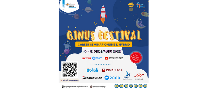 BINUS Festival kali ini masih dilakukan secara online, karena sikon yang belum kondusif dan akan lebih menjangkau mahasiswa dari berbagai lokasi, serta juga secara hybrid terbatas di kampus Anggrek. Kami, Tim Student Career Development BINUS, percaya keadaan ini tidak akan mengurangi semangat mahasiswa dalam meningkatkan kemampuan mereka, melalui kegiatan BFest ini salah satunya.