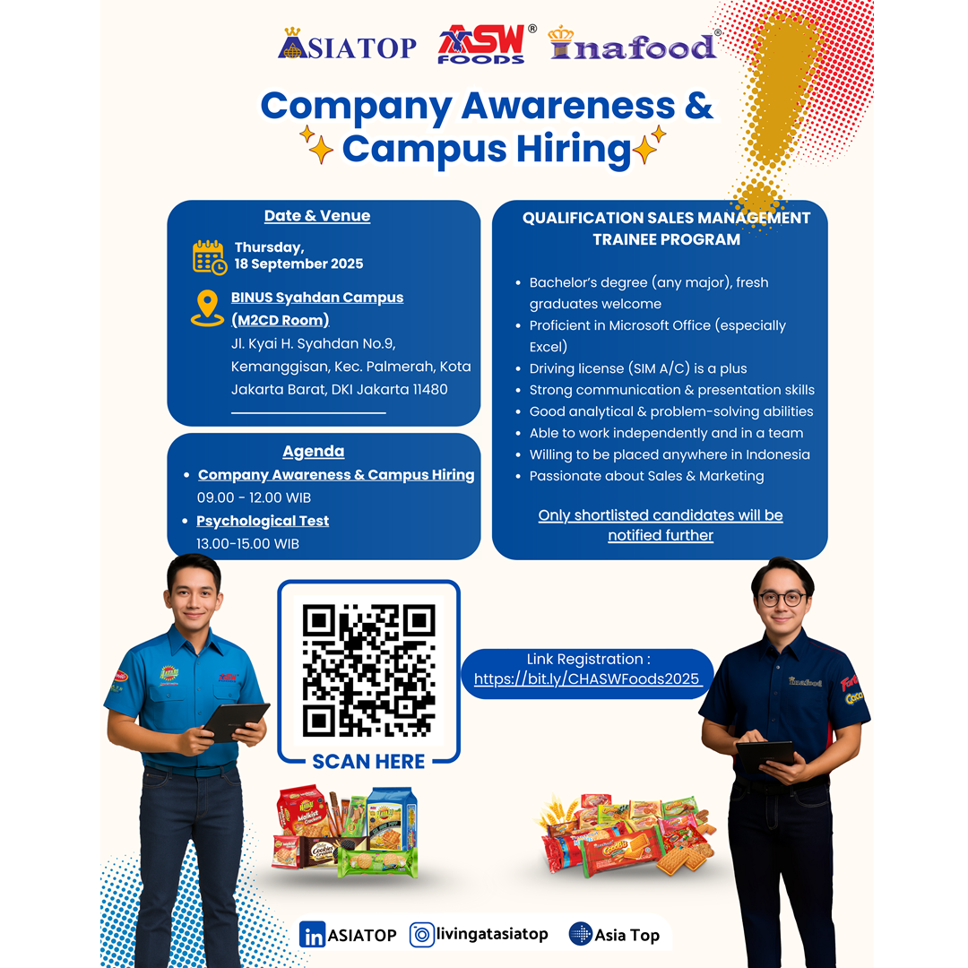Come join us, Our Sales Management Trainee Program is designed to develop future leaders by giving fresh graduates hands-on experience in the fast-paced FMCG industry. This program offers a fast track to leadership positions at ASIATOP.