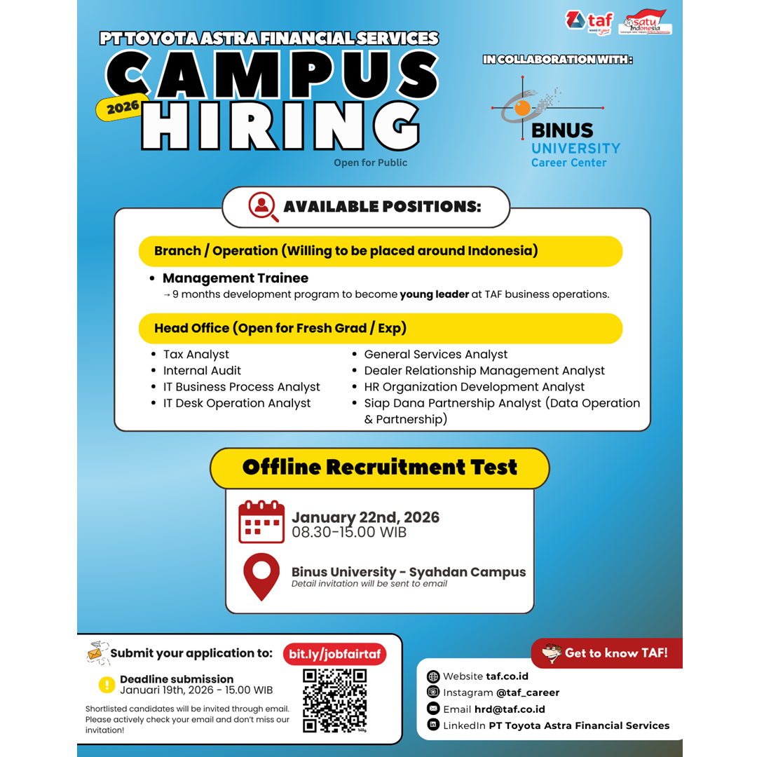 PT Toyota Astra Financial Services (TAF) kembali hadir di BINUS University untuk Campus Hiring. Kesempatan ini terbuka bagi lulusan BINUS tahun 2023, 2024, 2025, serta alumni yang sedang mencari peluang karier.