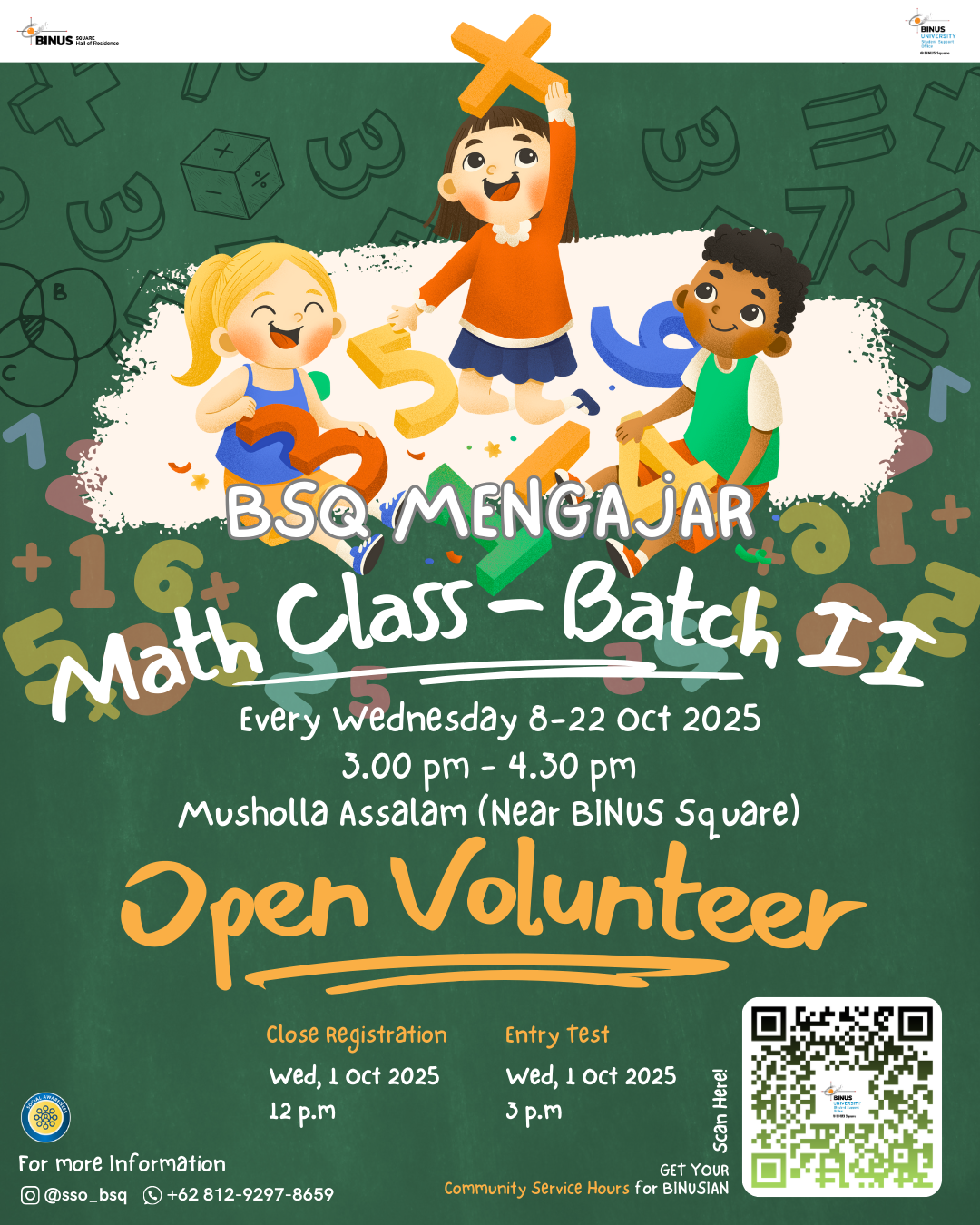 BINUS Square kembali membuka kesempatan kegiatan sosial yaitu BINUS Square Mengajar – Batch II nih! Kegiatan Sosial ini akan memberikan dampak kepada anak-anak di sekitar Mushola Assalam (+-350m dari BINUS Square) melalui pengajaran Matematika Tingkat SD