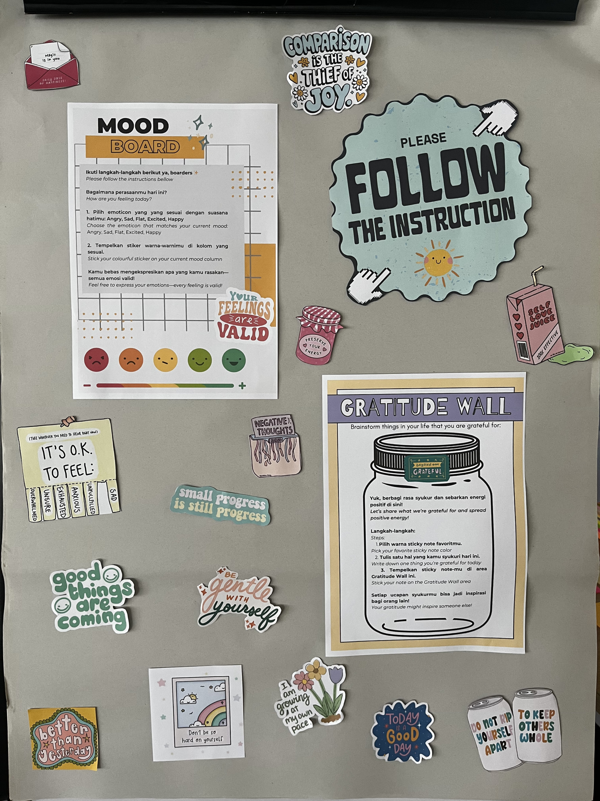 Setelah menyelesaikan sesi medical check-up, peserta diajak menuju area Gratitude Wall & Mood Board untuk mengekspresikan rasa syukur, menuliskan harapan, atau sekadar mencurahkan suasana hati. Bagi boarders yang ingin berbagi cerita atau unek-unek lebih privat, tersedia juga Kotak Curhat yang dapat diisi secara anonim.