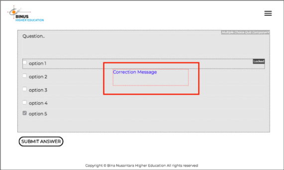 Fitur correction message pada kuis adalah fitur yang digunakan sebagai pop up informasi jawaban benar untuk user yang telah menjawab salah melebihi batas maksimum percobaan. Informasi di dalam correction message dapat anda ubah sesuai dengan kebutuhan digital content anda. Berikut adalah cara menambahkan correction message pada BITS: