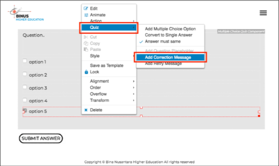 - Arahkan kursor anda ke bagian option, lalu klik kanan, selanjutnya pilih quiz, lalu pilih add correction message