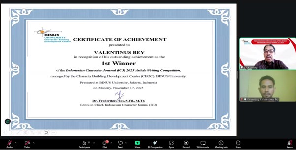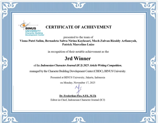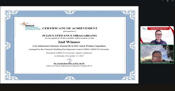Jakarta, 17 November 2025 — BINUS University sukses menyelenggarakan Penganugerahan Pemenang Lomba Artikel Ilmiah Indonesian Character Journal (ICJ) 2025 yang dikelola oleh Character Building Development Center (CBDC). Kegiatan ini bertujuan untuk menguatkan tradisi riset, membangun karakter akademik, dan mendorong refleksi kritis di kalangan mahasiswa, dosen, dan peneliti muda.