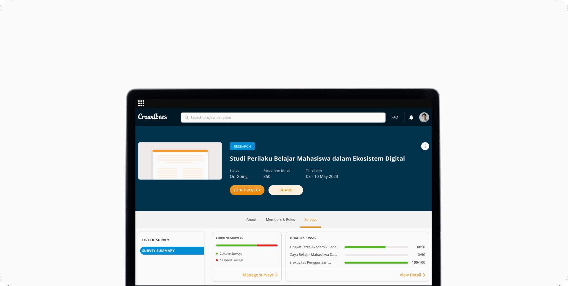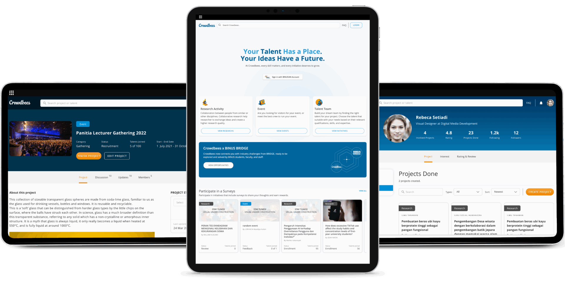 Crowdbees bermula dari gagasan untuk menghadirkan ruang digital yang mempertemukan berbagai ide dan inisiatif di lingkungan BINUS. Kami merancangnya sebagai tempat di mana mahasiswa dan dosen dapat berkolaborasi, saling mendukung, dan mewujudkan kegiatan bersama dalam satu ekosistem terbuka.