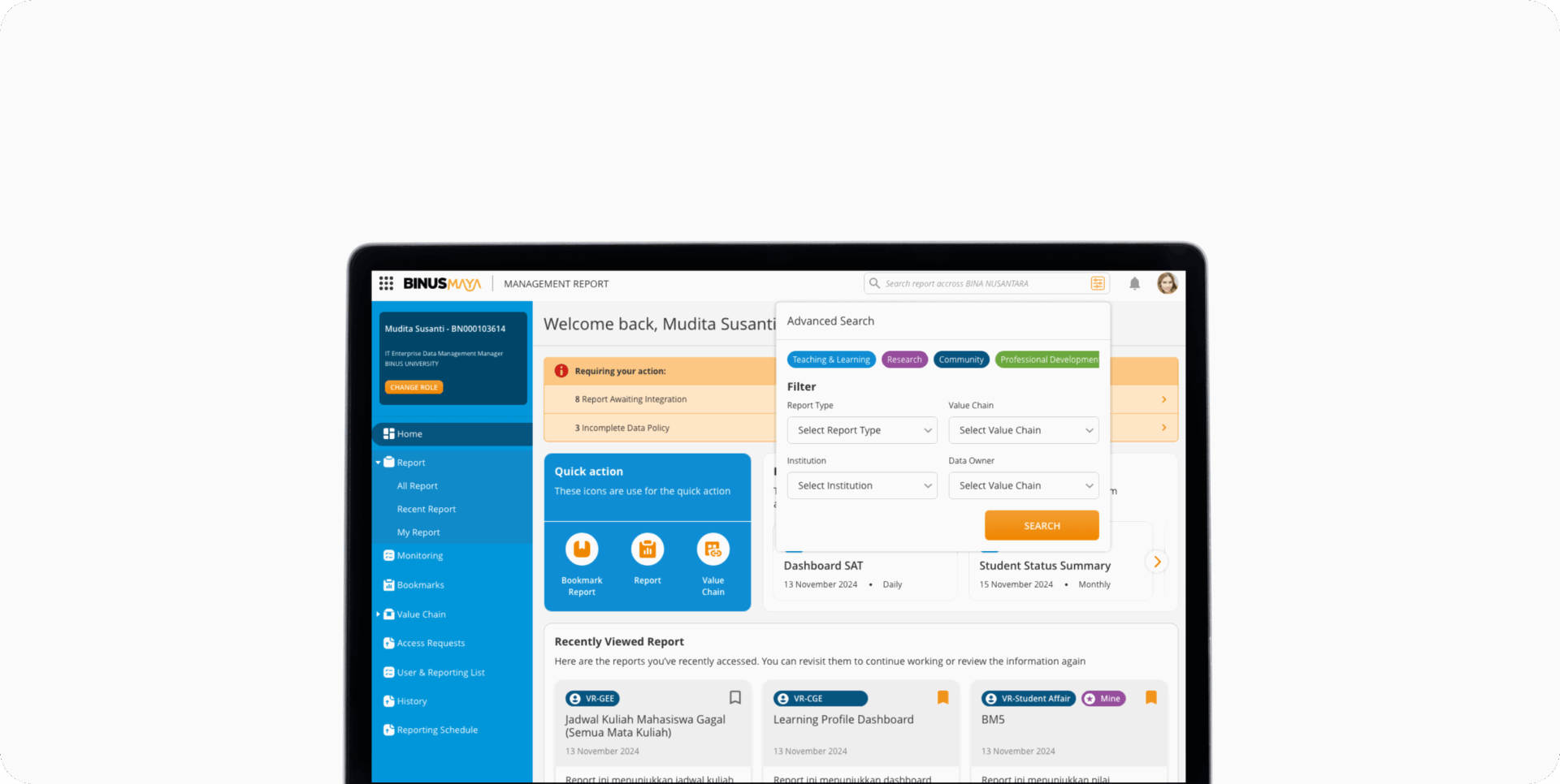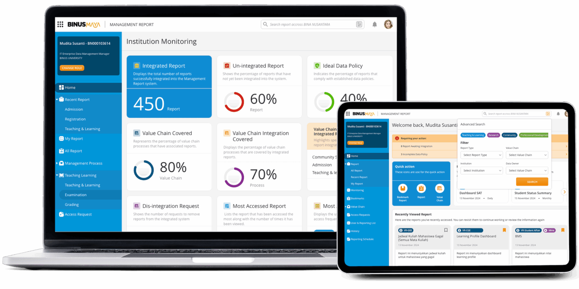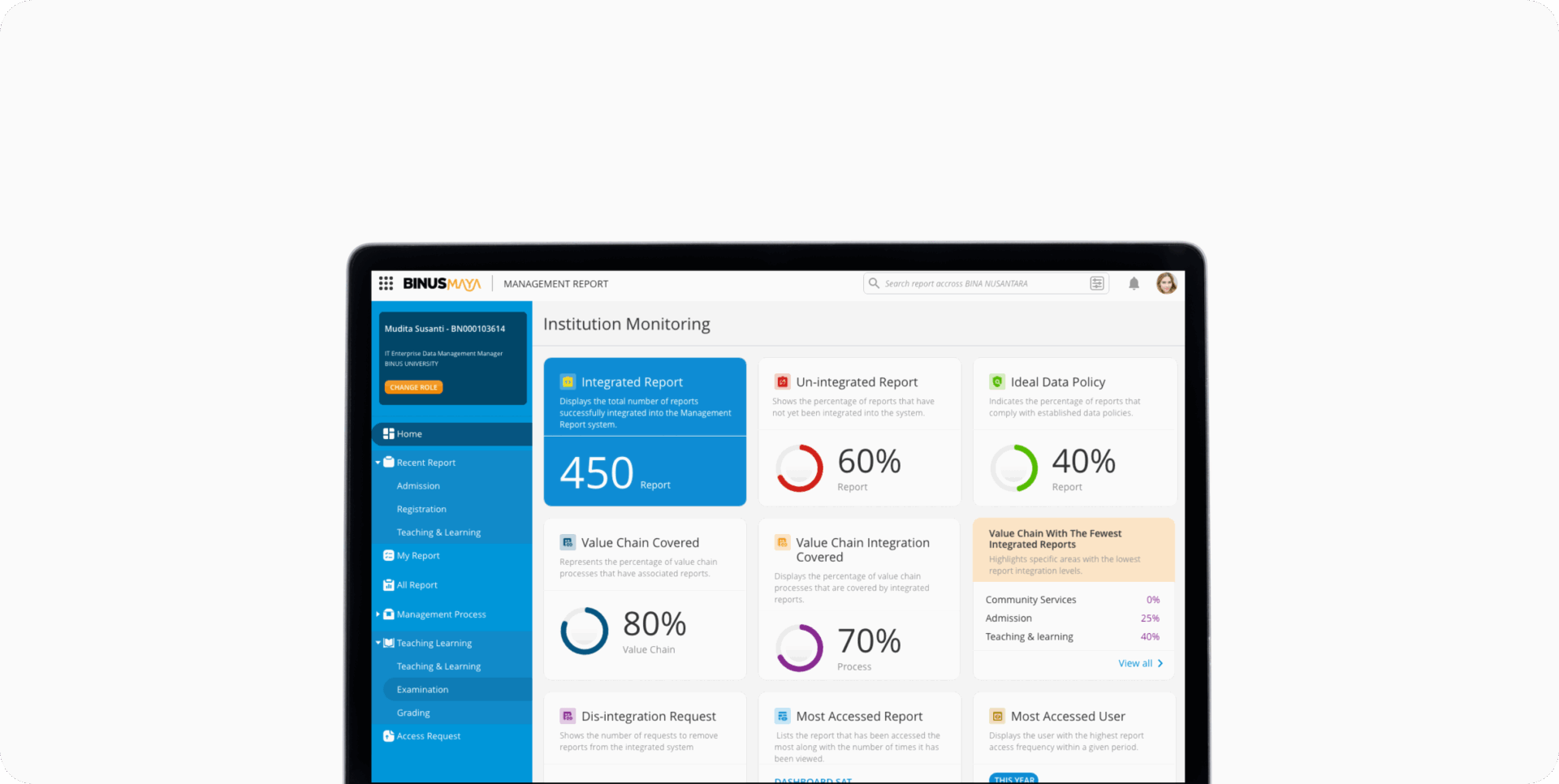 Sebagai bagian dari perjalanan transformasi digital BINUS, berbagai inisiatif terus dilakukan untuk menghadirkan sistem yang memperkuat tata kelola institusi berbasis data. Salah satu wujud nyata dari upaya ini adalah pengembangan sistem Management Report (MR), sebuah platform analitik yang dirancang untuk membantu pimpinan dalam melihat, menganalisis, dan memahami data institusi secara menyeluruh guna mendukung pengambilan keputusan yang cepat, akurat, dan berdampak.