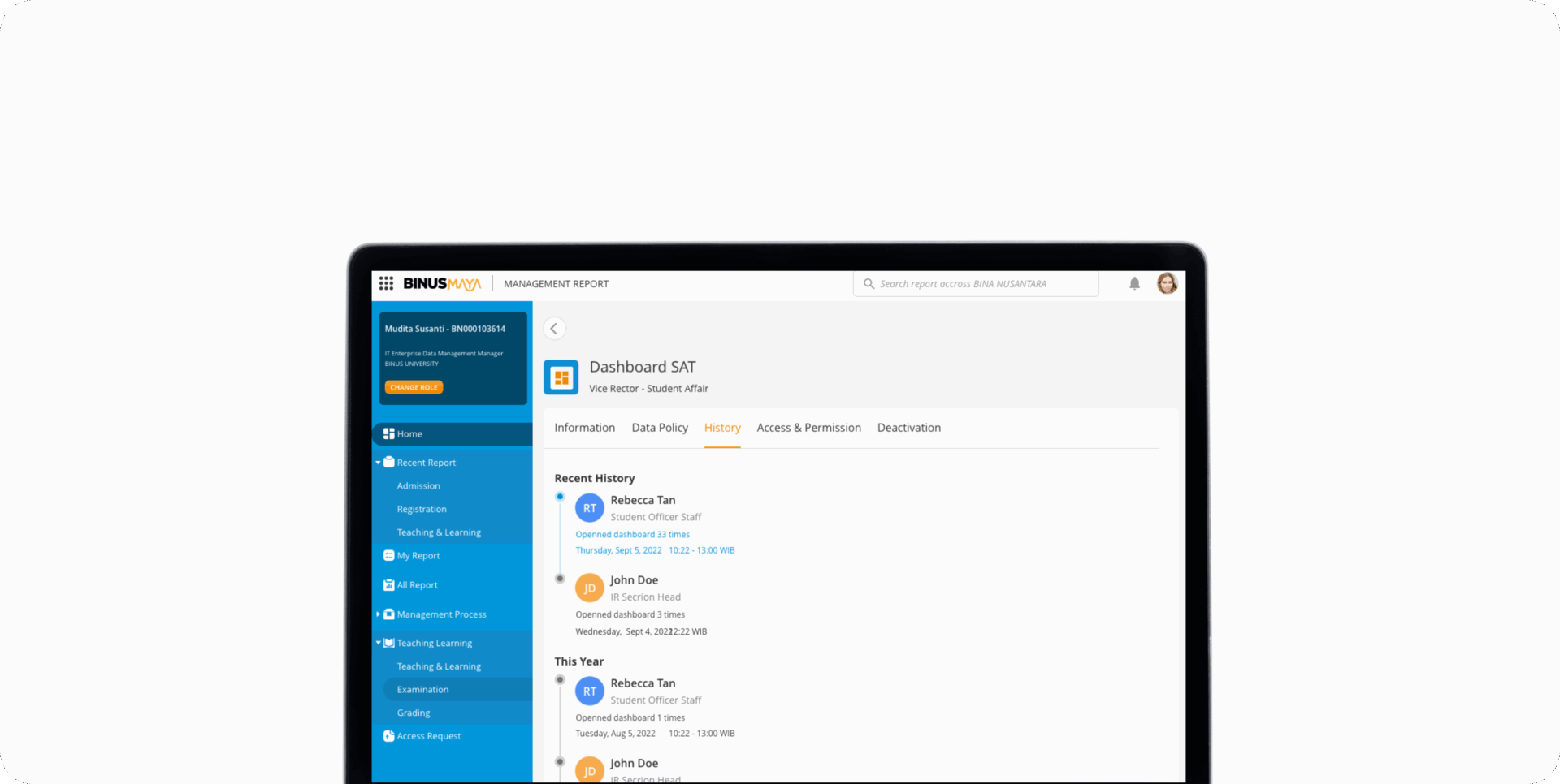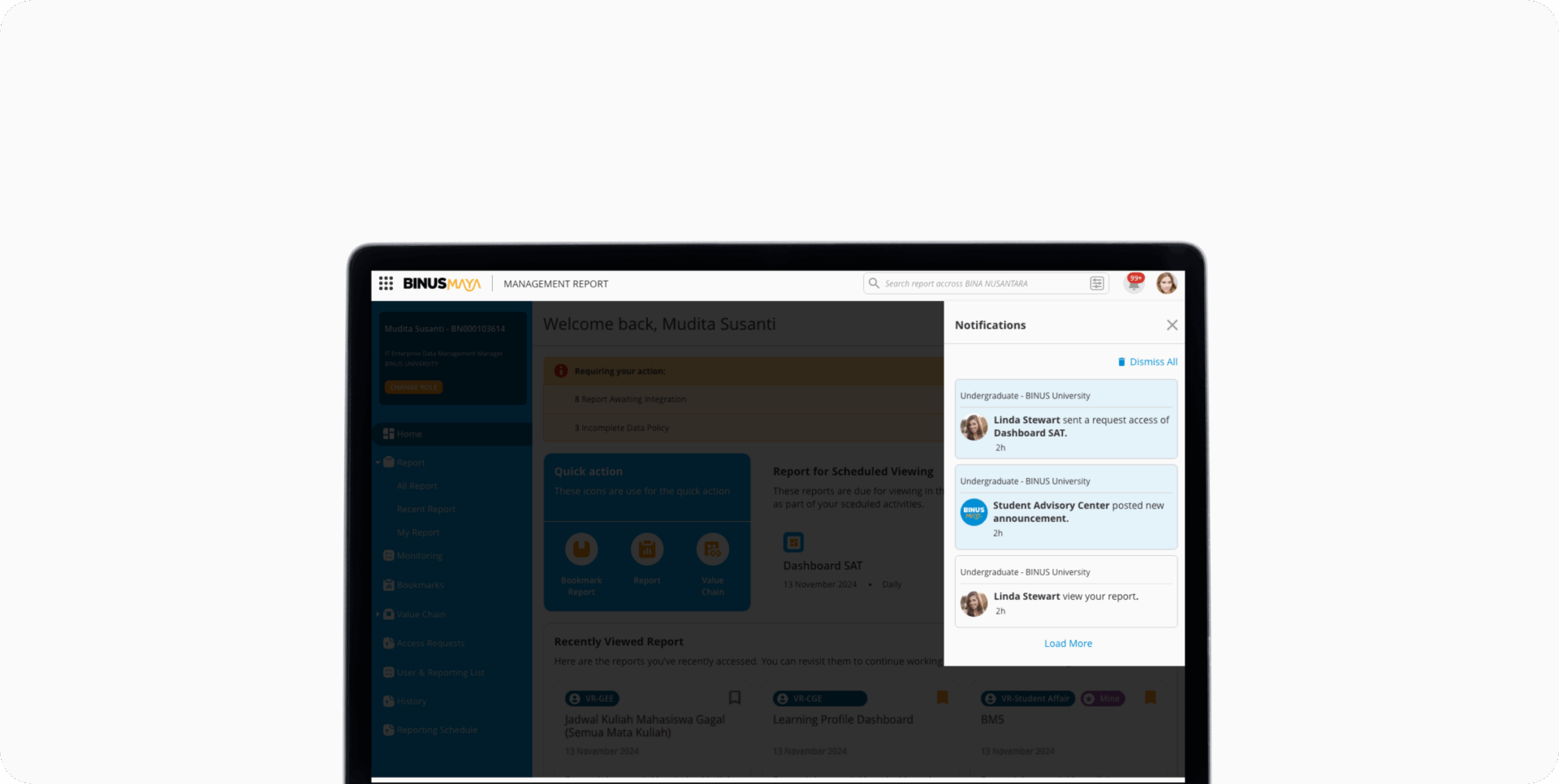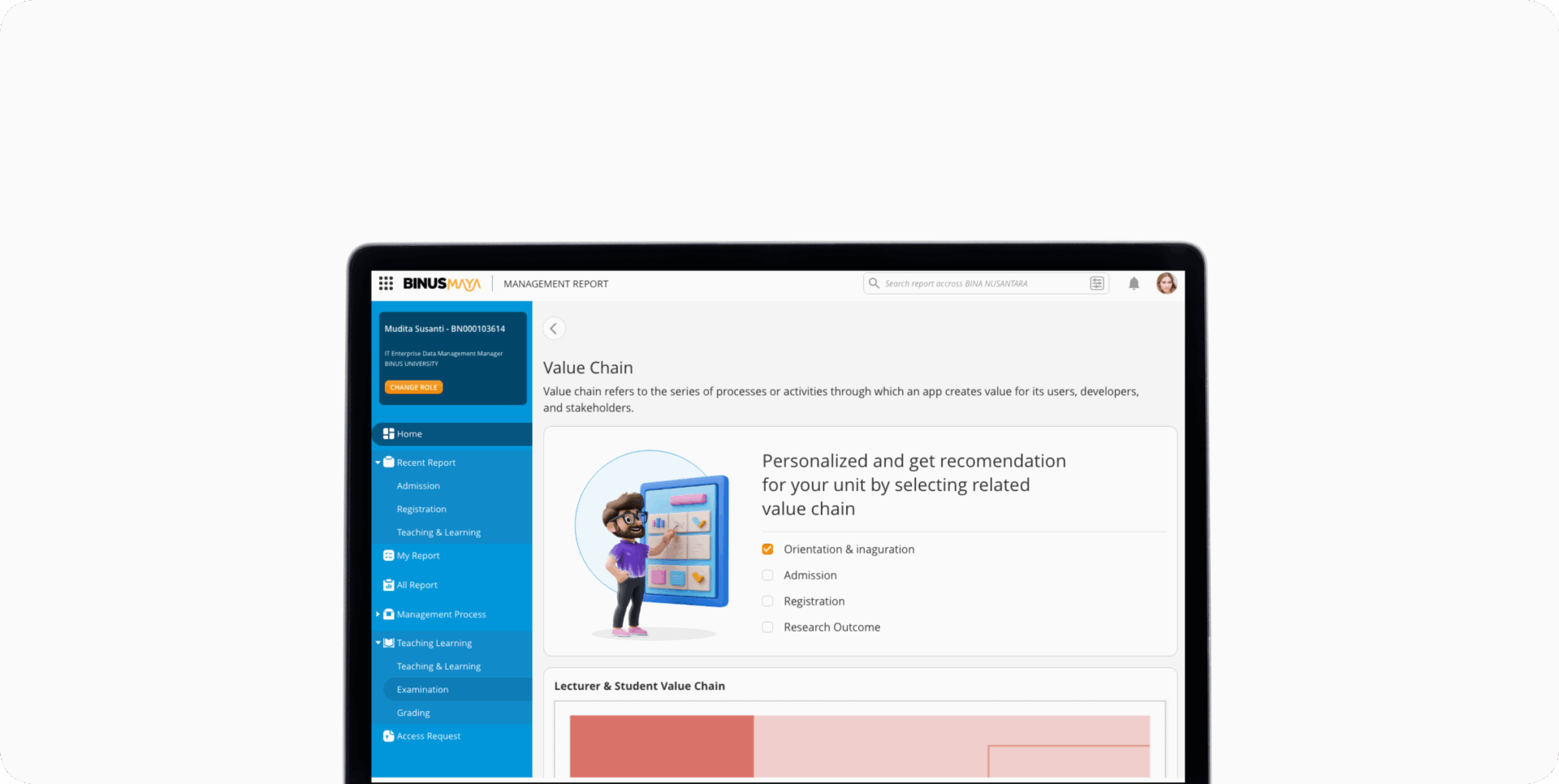 Sebagai bagian dari perjalanan transformasi digital BINUS, berbagai inisiatif terus dilakukan untuk menghadirkan sistem yang memperkuat tata kelola institusi berbasis data. Salah satu wujud nyata dari upaya ini adalah pengembangan sistem Management Report (MR), sebuah platform analitik yang dirancang untuk membantu pimpinan dalam melihat, menganalisis, dan memahami data institusi secara menyeluruh guna mendukung pengambilan keputusan yang cepat, akurat, dan berdampak.