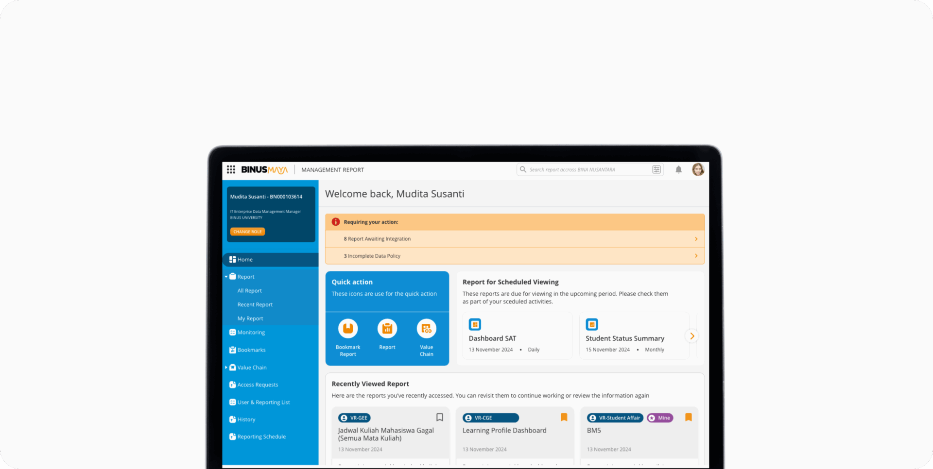 MR tidak hanya menampilkan data, tetapi juga membantu mengungkap insight dan pola penting yang menjadi dasar dalam pengambilan keputusan berbasis data (data-driven decision making). Dengan demikian, Management Report (MR) menjadi fondasi BINUS sebagai smart and connected higher education, yang menempatkan data sebagai sumber makna yang menggerakkan keputusan cepat, akurat, dan berdampak di setiap langkah strategis BINUS Higher Education.