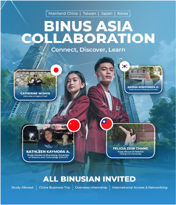 BINUS Asia Collaboration merupakan inisiatif yang membuka peluang bagi seluruh Binusian untuk belajar, terhubung, dan memperluas wawasan melalui berbagai program internasional di Asia seperti Mainland China, Taiwan, Jepang, dan Korea.