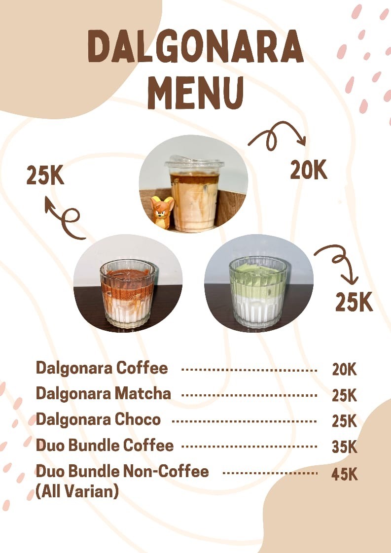 Dalgonara adalah merek minuman yang menawarkan berbagai pilihan minuman, termasuk varian berbasis kopi dan non-kopi. Terinspirasi dari tren dalgona yang viral pada tahun 2020, kami bertujuan untuk menghidupkan kembali minuman yang digemari ini dengan menghadirkan inovasi yang lebih inklusif, seperti rasa matcha dan cokelat. Minuman kami dibuat dengan bahan-bahan berkualitas tinggi untuk menghasilkan rasa yang kaya dan creamy di setiap cangkir, serta memberikan tampilan yang menarik pada produk ini.