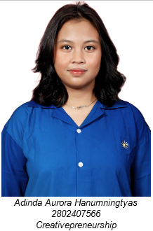 Adinda Aurora Hanumningtyas (2802407566) adalah mahasiswa jurusan Creativepreneurship yang telah membuktikan semangat kewirausahaannya dengan mendirikan tiga bisnis di berbagai bidang, yaitu Komodoz Gym, Zainfams Fashion, dan Canteen Bahagia. Dengan visi yang kuat serta kemampuan dalam membaca peluang pasar, Adinda berhasil mengembangkan bisnis yang tidak hanya menawarkan produk dan layanan berkualitas tetapi juga memberikan dampak positif bagi pelanggan dan komunitasnya.
