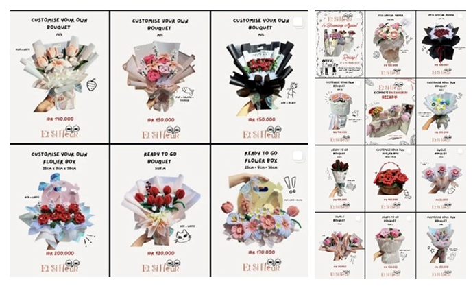 Untuk event seperti bazaar, Et Si Fleur juga menyediakan opsi bunga pertangkai yang bisa dibeli satuan, dengan harga mulai dari Rp 13.000+, serta layanan tambahan additional wrapping untuk mempercantik tampilan bunga dengan biaya Rp 8.000.