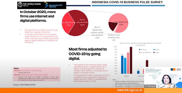 COVID memiliki dampak dalam kehidupan sehari-hari seseorang, dengan diperlakunya karantina dan isolasi mandiri. Bisnis yang mengandalkan interaksi secara langsung dengan customer tentunya harus menyesuaikan diri untuk memenuhi kebutuhan customer. Menurut Indonesia COVID-19 Business Pulse Survey, Perusahaan serta bisnis lainnya menerapkan digitalisasi sebagai cara untuk mengadaptasi dengan masa-masa dimana kontak dengan customer terbatas.[1]