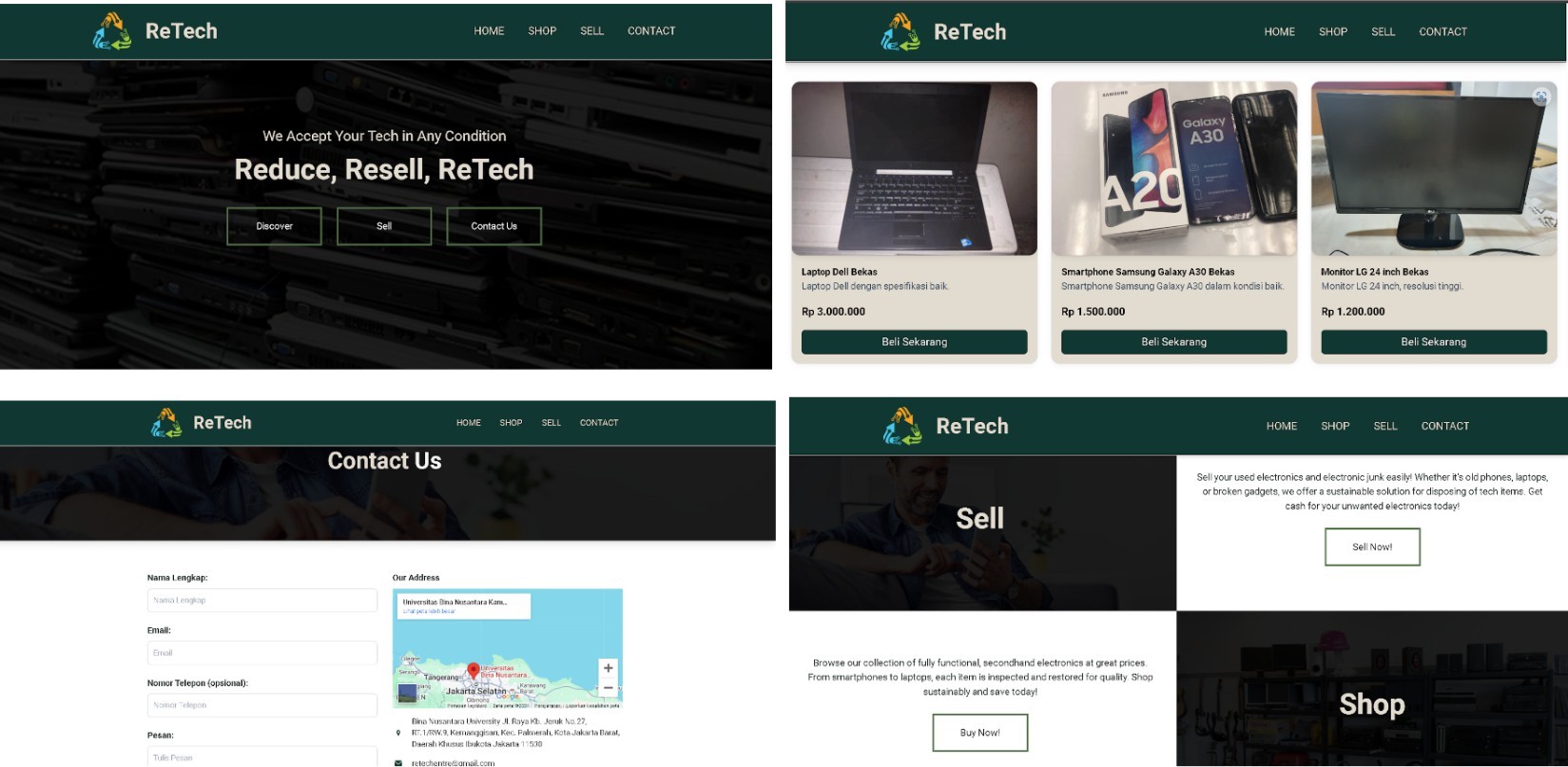 Pada November 2024, kami berkesempatan untuk memamerkan ide bisnis dan website kami di BINUS Festival. Tim kami sendiri berpartisipasi di Kampus Anggrek, Kemanggisan. Dalam acara tersebut, kami menerima banyak kunjungan dari teman-teman mahasiswa. Ada yang merasa puas dengan aplikasi kami, dan ada pula yang memberikan masukan untuk perbaikan. Kami sangat mengapresiasi semua respon positif dan kritik yang kami terima di pameran ini. Hal tersebut menjadi motivasi bagi kami untuk terus menyempurnakan bisnis Re-Tech agar siap diluncurkan dan dapat diterima dengan baik oleh masyarakat luas. Sekiranya inovasi-inovasi termutakhir seperti ReTech dapat memicu kesadaran masyarakat akan limbah elektronik, serta menaruh perhatian lebih terhadap pengolahan limbah elektronik seperti pada limbah biasa. Mari kita selamatkan lingkungan kita dari limbah elektronik. Reduce, Resell, ReTech.
