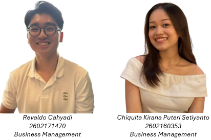 Revaldo Cahyadi dan Chiquita Kirana Puteri Setiyanto adalah mahasiswa Program Studi Business Management di BINUS University yang berkolaborasi membangun Blax Garage, sebuah bisnis bengkel modifikasi mobil yang berfokus pada pencahayaan interior dan eksterior kendaraan.