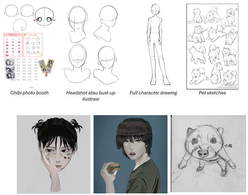 Usaha ini berfokus pada jasa komisi gambar ilustrasi, baik digital maupun tradisional, dengan berbagai gaya seperti chibi, headshot, bust-up, full character drawing, hingga sketsa hewan peliharaan. Setiap karya dirancang dengan pendekatan personal yang ekspresif dan imajinatif, menjadikan setiap ilustrasi memiliki karakter dan nilai sentimental yang khas.