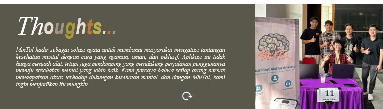 Dengan segala tantangan yang dihadapi, kami merasa sangat bangga dapat membuat MinTol sebagai aplikasi yang tidak hanya inovatif secara teknikal, tetapi juga berdampak positif bagi kesehatan mental penggunanya. Kami berharap MinTol dapat terus berkembang dan menjadi solusi yang membantu banyak orang dalam perjalanan mereka menuju kehidupan yang lebih sehat secara mental.