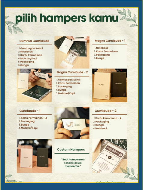 Kami menyediakan hampers custom dan ready stock sebagai kado wisuda yang dapat mengukuhkan nilai persahabatan, merawat kenangan berharga, dan menciptakan pengalaman presiasi yang mendalam bagi wisudawan.