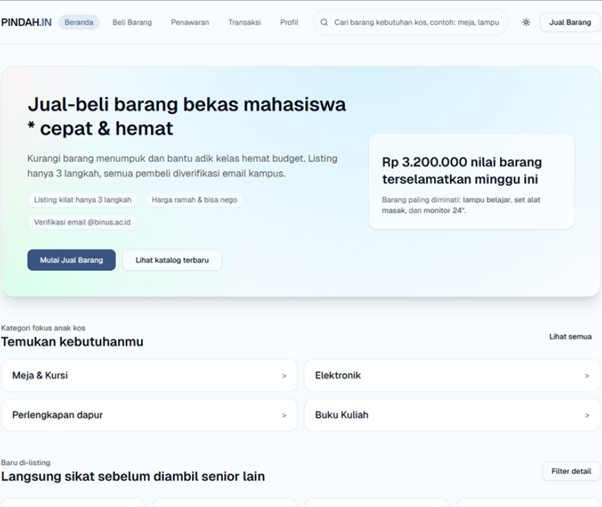 Aplikasi jual beli barang bekas khusus mahasiswa BINUS yang bertujuan mempermudah transaksi barang layak pakai di lingkungan kampus. Aplikasi ini mendukung tawar harga, kategori kebutuhan kos, dan transaksi langsung antar mahasiswa.