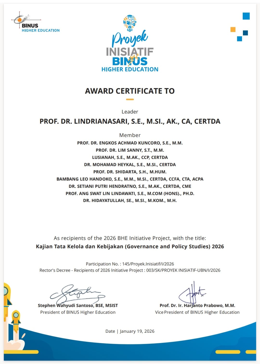 Center of Excellence for Governance and Policy Studies (CoE GPSs) memperoleh penghargaan 2026 BHE Initiative Project dari BINUS Higher Education melalui proyek bertajuk “Kajian Tata Kelola dan Kebijakan (Governance and Policy Studies) 2026.” Penghargaan ini merupakan bentuk apresiasi institusi atas kontribusi dan komitmen CoE GPSs dalam pengembangan kajian tata kelola serta kebijakan yang mendukung peningkatan kualitas keilmuan dan rekomendasi berbasis riset.