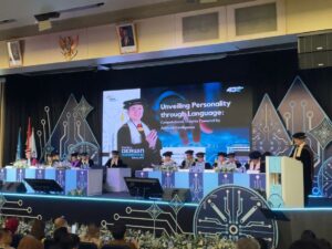 Prof. Dr. Ir. Derwin Suhartono, S.Kom.,MTI menyampaikan gagasannya dalam bentuk orasi ilmiah yang berjudul “Unveiling Personality Through Language: Computational Insights Powered by Artificial Intelligence”. Dalam pemaparannya beliau menjelaskan mengenai AI itu bukan sebuah ilmu baru dalam Computer Science, tetapi AI menjadi pusat perhatian dalam perkembangan teknologi. AI adalah teknologi yang terus berkembang, saat ini AI terus mendominasi tetapi perannya terus berubah dan beradaptasi dengan teknologi serta kebutuhan masyarakat. NLP (Natural Language Processing) digunakan dalam berbagai aplikasi termasuk Chatbot atau biasa disebut sebagai ChatGPT, analisis sentimen, mesin translation dan personality computation. Personality Computation merupakan bidang multidisiplin yang menggabungkan AI dan psikologi dalam menganalisis serta memprediksi ciri kepribadian manusia.