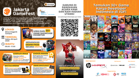 Jakarta, 17 April 2025 – Jurusan Game Application and Technology (GAT) BINUS University mengumumkan pelaksanaan perdana Jakarta GameFest 2025 (JGF), sebuah acara game berskala besar yang akan digelar pada Sabtu, 26 April 2025 mulai dari pukul 09.00 sampai pukul 17.00 di lantai 1, BINUS @Kemanggisan, Anggrek Campus, Jakarta Barat. Acara ini akan menghadirkan lebih dari 40 studio game dan komunitas pengembang game, yang akan memamerkan karya-karya mereka kepada pengunjung.