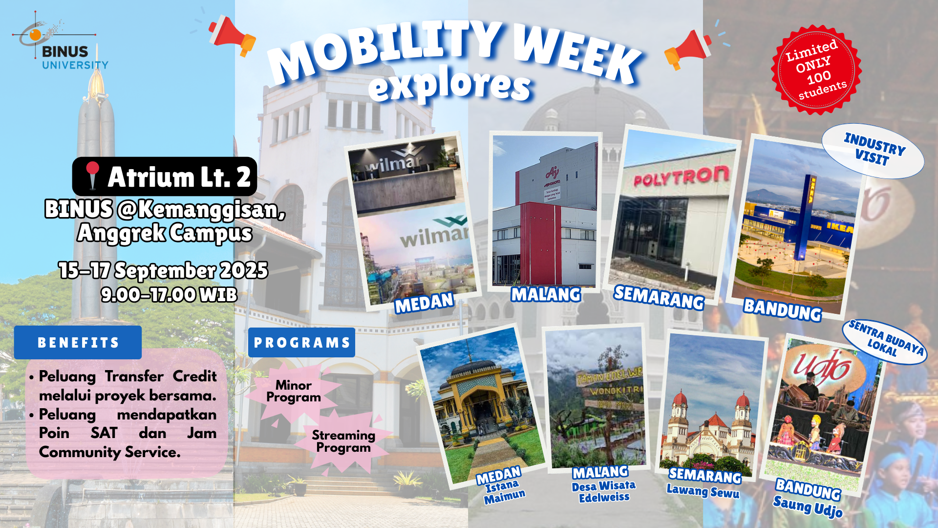 BINUS Mobility Week hadir di BINUS Kemanggisan untuk memberikan kesempatan bagi BINUSIAN 28 dalam memilih Minor Program atau Streaming di semester 4 dan 5. Acara ini juga membuka peluang bagi mahasiswa untuk menjelajahi kampus BINUS di kota lain, mengenal budaya lokal, serta membangun koneksi dengan BINUSIAN dari berbagai kampus. Melalui kegiatan ini, mahasiswa diharapkan kompetensi dan pengalaman mahasiswa dapat semakin berkembang.