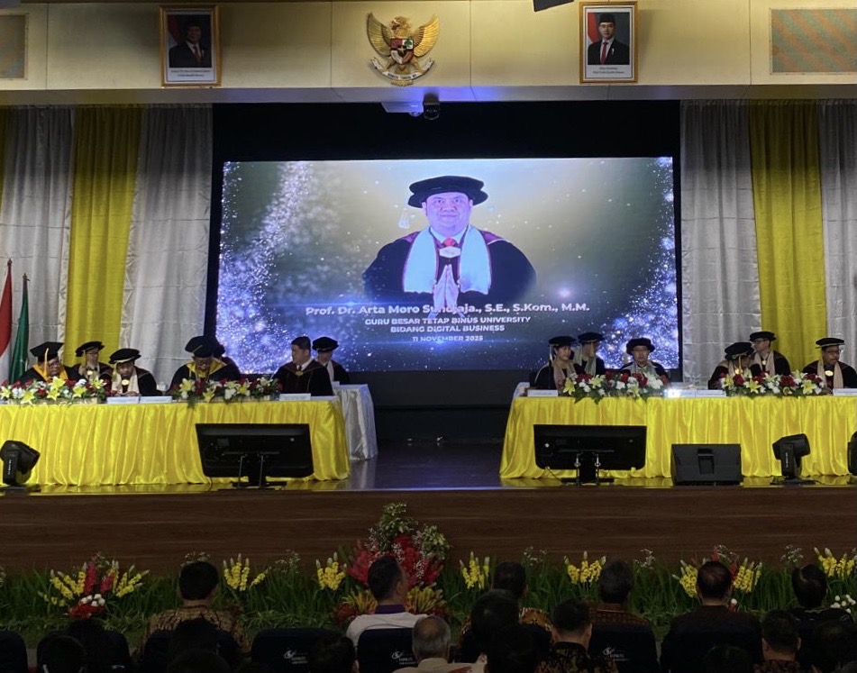 Jakarta, 11 November 2025 – BINUS University secara resmi mengukuhkan Prof. Dr. Arta Moro Sundjaja, S.Kom., S.E., M.M., CDMS, sebagai Guru Besar Tetap Bidang Ilmu Digital Bisnis. Pengukuhan ini menandai pencapaian tertinggi dalam karir akademik Prof. Dr. Arta yang perjalanannya dimulai sebagai seorang Binusian.