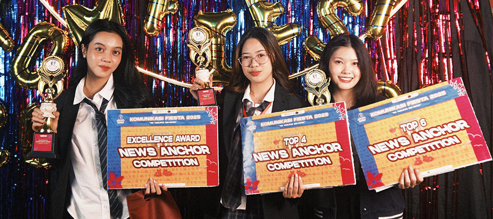 Mahasiswa Ilmu Komunikasi BINUS @Malang itu mboyz-mboyz. Bukan hanya secara akademik, namun secara prestasi, mahasiswa Ilmu Komunikasi Binus kembali menunjukkan kualitasnya dalam ajang bergengsi tingkat nasional. Dalam kompetisi News Anchor Competition KOMFIEST 2025 yang diselenggarakan oleh Universitas Kristen Widya Mandala Surabaya, tiga mahasiswa berhasil meraih prestasi membanggakan. Koming Katrina meraih Juara 3, sementara Catharina Eka Putri masuk dalam Top 4, dan Vienna Evelyn berhasil menembus Top 6. Ketiganya tampil menonjol dengan kemampuan penyiaran berita yang profesional dan penuh percaya diri setelah berhari-hari berlatih di lab bersama rekan-rekan Sunib Production.