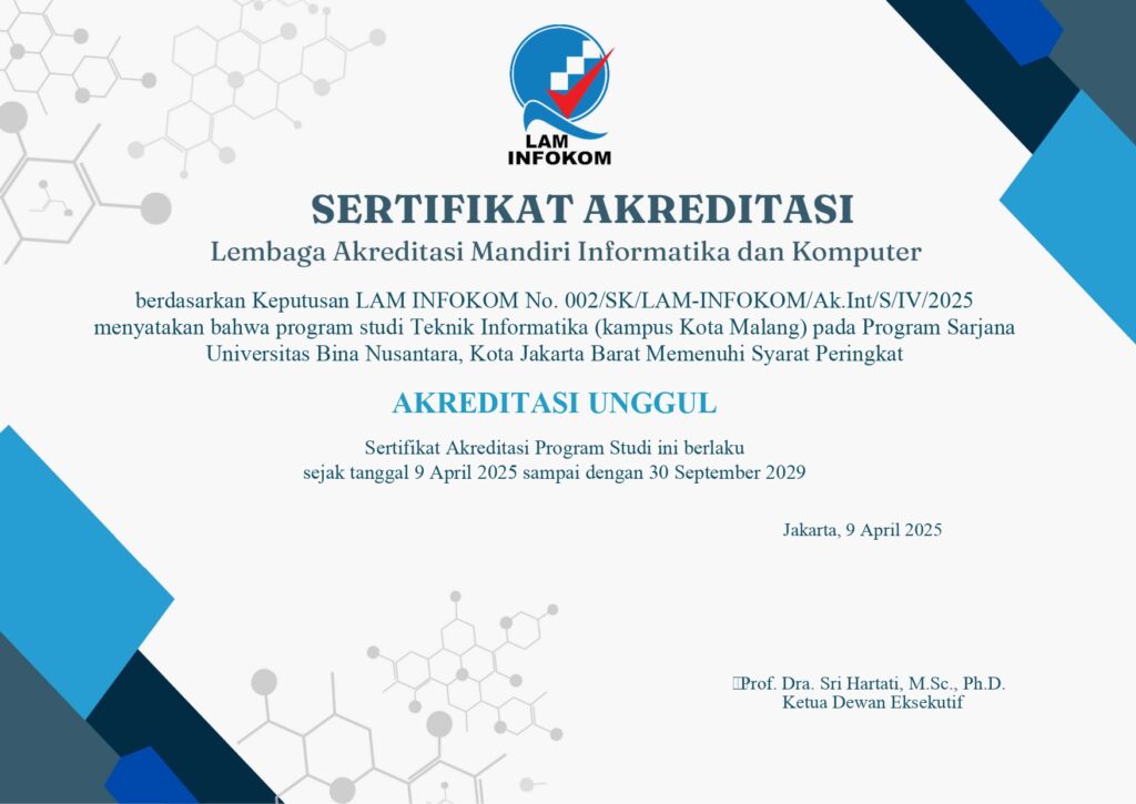 Program Studi Teknik Informatika BINUS @Malang meraih pencapaian penting melalui perolehan Akreditasi Unggul dari LAM INFOKOM (Lembaga Akreditasi Mandiri Informatika dan Komputer). Keputusan ini tertuang dalam Surat Keputusan No. 002/SK/LAM-INFOKOM/Ak.Int/S/IV/2025, dan berlaku mulai tanggal 9 April 2025 hingga 30 September 2029.