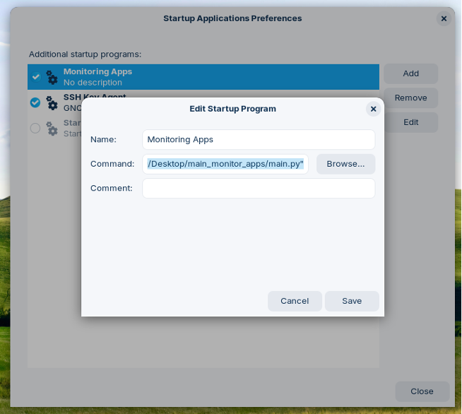 Thirdly, click the ‘Add’ button and give it a free name, for example, in my case, I filled in ‘Monitoring Apps’. For the command, please fill it in as follows: gnome-terminal — bash -c “python3 /home/csmalang/Desktop/main_monitor_apps/main.py”