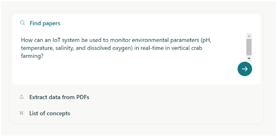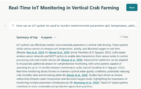 Gambar 2. merupakan ringkasan dari Elicit yang merangkum empat artikel utama terkait pertanyaan penelitian: “How can an IoT system be used to monitor environmental parameters (pH, temperature, salinity, and dissolved oxygen) in real-time in vertical crab farming?”. Ringkasan tersebut menjelaskan bahwa sistem IoT memanfaatkan berbagai sensor untuk memantau parameter lingkungan seperti pH, suhu, salinitas, dan oksigen terlarut secara real-time. Teknologi yang digunakan meliputi jaringan sensor nirkabel LoRa dan protokol komunikasi MQTT yang memungkinkan transmisi data dari sensor ke unit pemrosesan pusat atau perangkat seluler. Selain itu, beberapa sistem canggih memiliki kemampuan beroperasi hingga 12 bulan tanpa pemeliharaan, memungkinkan pemantauan lingkungan yang komprehensif dan efisien.
