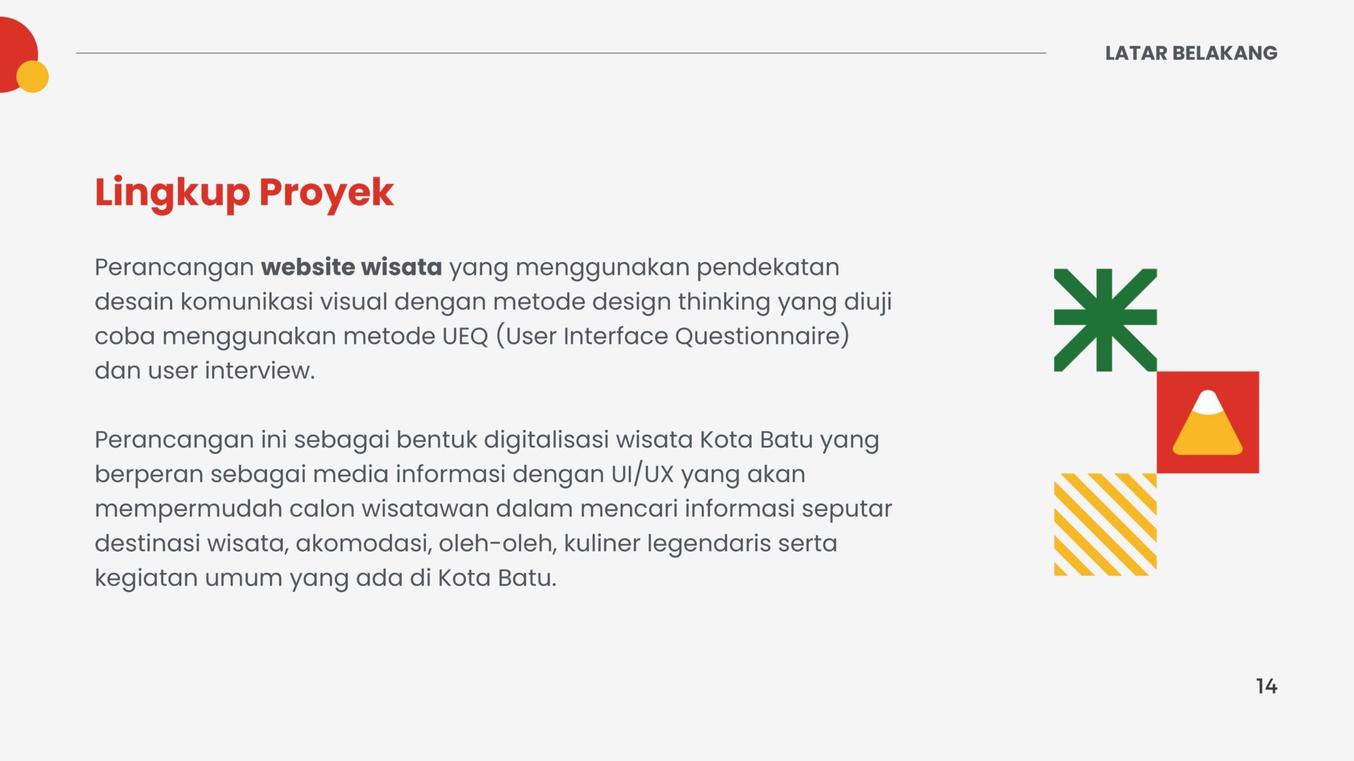 - Define: a stage to determine the core of a problem through in-depth research around a defined problem. The author conducted research through the website and social media of the Batu City Tourism Department, previous literature, and questionnaires. The purpose of the questionnaire is to find out the responses about the UI/UX of the Batu City Tourism Department website. Besides that, the author can analyze their interest in tourism activities and their opinions about the features of the future tourism website.