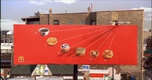 Iklan billboard makanan ini cukup menarik yang menonjolkan kreativitasnya, iklan ini berasal dari Perusahaan makanan terbesar yaitu McDonal’s bernama Sundial Billboard yang diluncurkan di Chicago, Amerika Serikat. Billboard ini tidak sama dengan billboard pada umumnya yang hanya menampilkan sebuah gambar maupun teks, tetapi billboard ini memanfaatkan sebuah sinar matahari dalam desainnya.