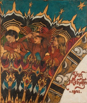 Lukisan Three Angels karya Józef Mehoffer adalah salah satu karya seni simbolis yang menggabungkan elemen-elemen keagamaan dan mistik. Lukisan ini menggambarkan tiga malaikat yang menyimbolkan kekuatan spiritual dan unsur ketuhanan. Dalam karya ini, Mehoffer menggunakan warna-warna cerah dan kontras untuk menonjolkan karakteristik masing-masing malaikat, dengan komposisi yang penuh dengan detail dan ornamen yang kaya.