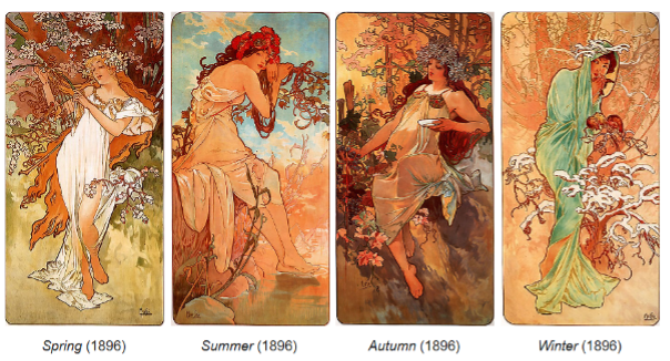 “The Seasons” (1896) karya Alphonse Mucha merupakan ilustrasi yang menggambarkan empat musim—Musim Semi, Musim Panas, Musim Gugur, dan Musim Dingin—dengan sosok wanita sebagai personifikasinya. Setiap musim memiliki karakteristik unik yang tercermin dalam ekspresi, warna, dan elemen visual. Musim Semi dilukiskan dengan warna lembut dan bunga yang bermekaran sebagai simbol kehidupan baru, sementara Musim Panas menampilkan cahaya hangat dan tumbuhan subur yang mencerminkan kebahagiaan serta puncak kehidupan. Musim Gugur hadir dengan nuansa keemasan dan anggur, melambangkan kedewasaan serta kehangatan, sedangkan Musim Dingin menampilkan sosok wanita berselimut dalam latar bersalju, mencerminkan keheningan dan introspeksi. Gaya Art Nouveau terlihat jelas dalam penggunaan garis melengkung, komposisi dekoratif, serta warna harmonis yang menciptakan nuansa emosional mendalam. Karya ini bukan sekadar ilustrasi dekoratif, tetapi juga menyampaikan filosofi tentang siklus kehidupan dan hubungan manusia dengan alam.