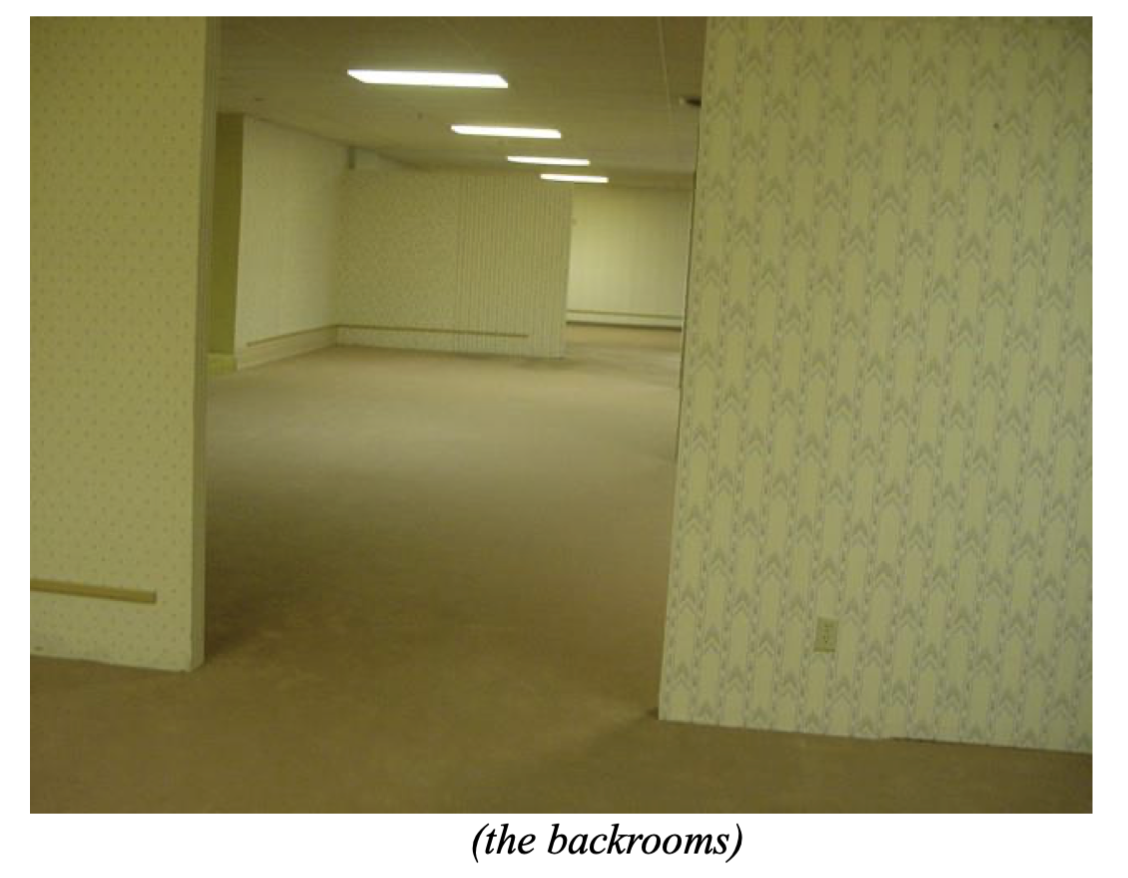 mengupload gambar berjudulkan “the back rooms”. Upload gambar tersebut disertai sebuah cerita dari si user tentang bagaimana kita dapat tanpa sadar menginjakkan kaki ke dunia atau dimensi lain yang mana salah satunya adalah back rooms ini yang meruapakan ruangan kuning monoton yang kosong.