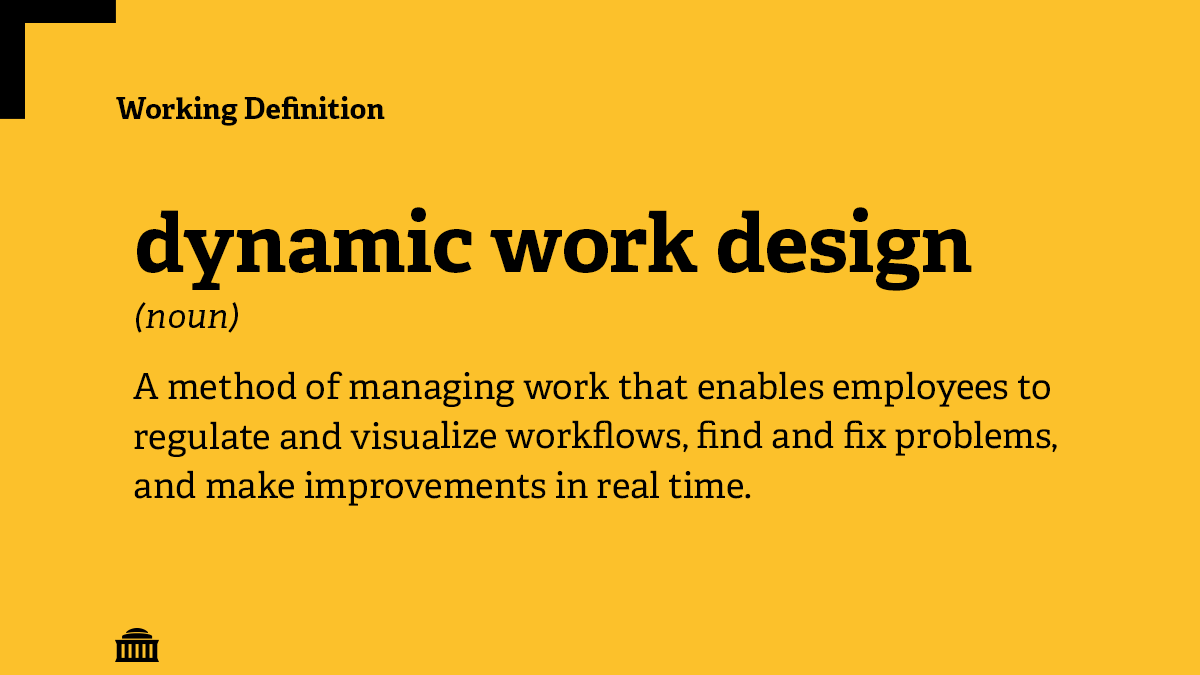 Dynamic Work Design (DWD) merupakan pendekatan yang merancang alur kerja adaptif dan responsif terhadap dinamika organisasi dan lingkungan bisnis. Tujuannya adalah memastikan pekerjaan di semua tingkat (strategis, taktis, hingga operasional) tetap terlihat, terukur, dan mudah disesuaikan saat perubahan diperlukan.