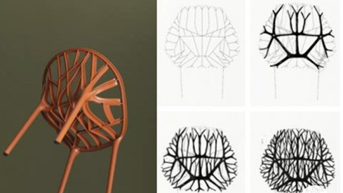 Pada gambar kanan, menampilkan evolusi skematik desain hasil integrasi kompleks menyerupai jaringan daun. Konsep biomimikri yang diadaptasi mencakup struktur cabang pohon dan vena daun untuk mencapai kekuatan maksimal dengan penggunaan material minimal dan distribusi tekanan alami, sementara estetika organik memberikan kesan harmonis yang mempererat hubungan pengguna dengan alam. Terinspirasi oleh prinsip biologi evolusioner, desain ini menunjukkan bagaimana bentuk dan fungsi bersinergi secara alami. Implikasi desainnya bukan hanya visual, tetapi juga struktural: menghasilkan kursi yang ringan, kuat, dan efisien secara material. Pendekatan ini mendukung desain berkelanjutan dan ekonomi sirkular, karena memungkinkan produksi dengan material tunggal yang mudah didaur ulang dan minim komponen tambahan.
