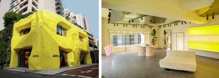Isabel Marant merupakan merek fashion asal Prancis yang didirikan pada tahun 1994 oleh Isabel Marant. Brand ini dikenal dengan karakter desain yang kasual, urban, dan effortless, mengedepankan kenyamanan, kebebasan berekspresi, serta kesan autentik. Identitas ini menjauh dari kemewahan yang berlebihan dan lebih menekankan sikap santai namun berkarakter. Nilai-nilai tersebut tidak hanya tercermin pada produk, tetapi juga diterjemahkan ke dalam strategi desain interior retail sebagai bagian dari pembentukan citra merek. Kolaborasi dengan seniman Jepang Yutaka Sone digunakan untuk merancang butik Isabel Marant Tokyo. Toko ini adalah instalasi seni dengan bentuk organik, permukaan tidak rata, dan warna kuning cerah yang kontras dengan lingkungan perkotaan Tokyo. Ini membedakannya dari butik fashion biasa. Pendekatan ini, menurut Dezeen dan Designboom, bertujuan untuk mengaburkan batas antara seni, arsitektur, dan penjualan sehingga toko dapat berfungsi sebagai pengalaman visual dan spasial selain sebagai ruang komersial. Bentuk luar toko menyatu dengan desain interiornya. Ruang yang dibuat secara asimetris dan tidak menggunakan sistem grid konvensional memungkinkan pengunjung untuk mengalami ruang dengan cara yang lebih alami dan intuitif. Toko Isabel Marant di Tokyo berbeda dari layout toko konvensional yang biasanya efektif dan berulang, pola ruangnya organik dan non-linear. Bukan urutan fungsi yang rigid, ruang adalah rangkaian pengalaman. Metode ini memberi pelanggan kesan eksploratif karena mereka menemukan barang-barang toko secara bertahap daripada melihatnya sekaligus. Secara psikologis, pola ini meningkatkan minat dan memperpanjang waktu kunjungan. Sirkulasi di toko tidak terarah dan mengalir. Dinding melengkung dan bentuk ruang yang berubah secara alami mengarahkan pengunjung tanpa menggunakan tanda yang dominan. Hal ini menghasilkan ritme pergerakan yang lebih santai dan tenang, yang sesuai dengan ciri khas merek Isabel Marant. Dari perspektif desain retail, jenis sirkulasi ini efektif dalam meningkatkan dwell time dan interaksi pelanggan dengan produk.