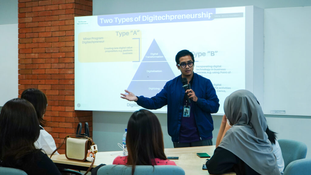 Dalam sesi ini, mahasiswa diperkenalkan pada konsep Digitechpreneur, yang menekankan pada pemanfaatan teknologi digital secara maksimal dalam menciptakan nilai tambah dalam bisnis. Tidak hanya sekadar menggunakan teknologi digital, tetapi menjadikannya sebagai elemen utama dalam membangun bisnis yang inovatif dan kompetitif. Selain itu, mahasiswa diberikan pemahaman mengenai mata kuliah yang akan mereka tempuh dalam program minor ini, yang dirancang untuk membekali mereka dengan wawasan tentang ekosistem Digitechpreneur secara lebih mendalam.
