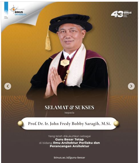 Selamat & Sukses untuk Prof. Dr. Ir. John Fredy Bobby Saragih, M.Si. sebagai Guru Besar Tetap di Bidang Keahlian Arsitektur Perilaku dan Perancangan Arsitektur | Professor BINUS