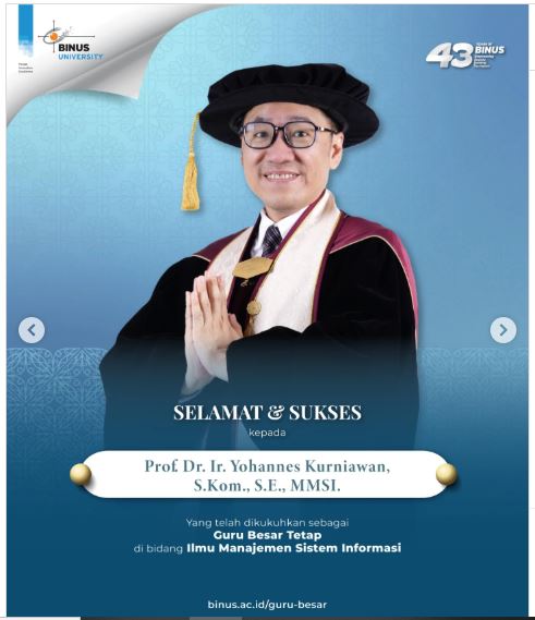 Selamat & Sukses untuk Prof. Dr. Ir. Yohannes Kurniawan, S.Kom., S.E., MMSI sebagai Guru Besar Tetap di bidang Manajemen Sistem Informasi. News professorbinus Share It :
