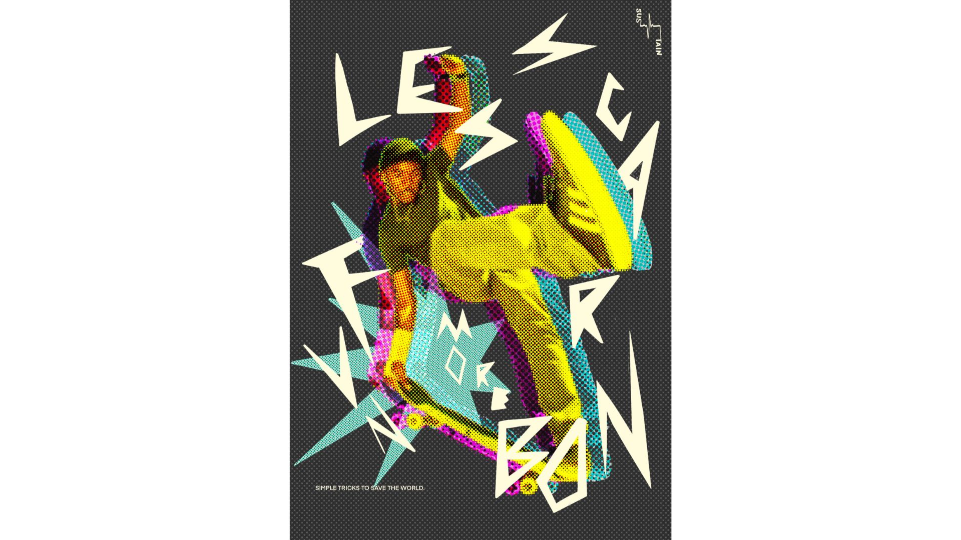 Take a look at the work of “Less Carbon More Fun,” by Aliftsa Heidi Mahira, who created this in 2024 as part of a Visual Making Project course and used low-bit digital graphics and Halftone techniques. This method simulates continuous tones and shades in an image by using varying sizes or densities of individual solid-color dots, which the human eye blends to create the illusion of smooth gradients and a full spectrum of light and dark.