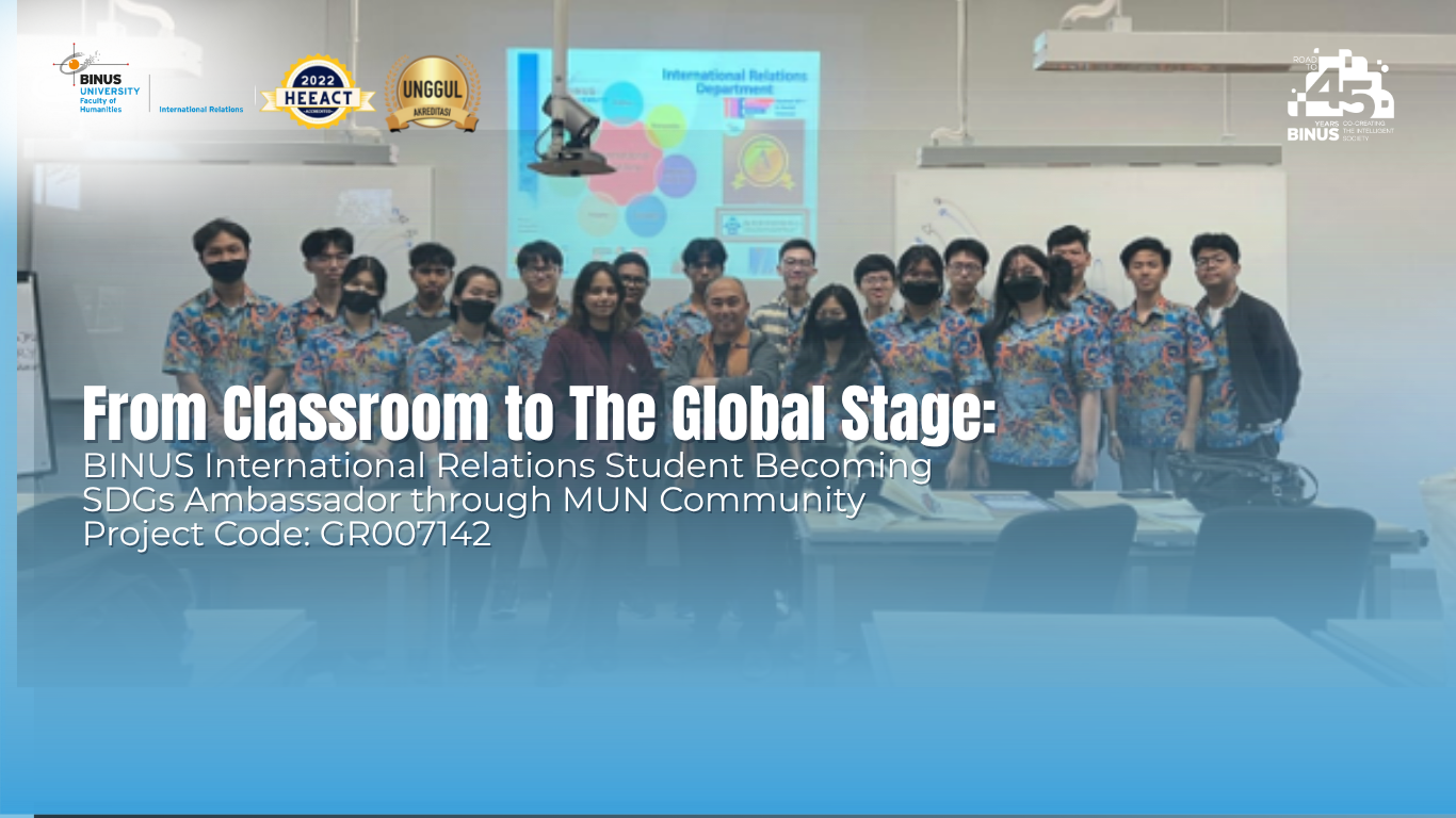 Bina Nusantara (BINUS) University International Relations majors and students developed a community that focuses on Model United Nations (MUN) activities. This community was formed based on a university program called the Initiative Project. This initiative project has been running since 2022. During its journey, the MUN Community began as a Talent Pool that focused on participating in MUN competitions at the international and national levels.