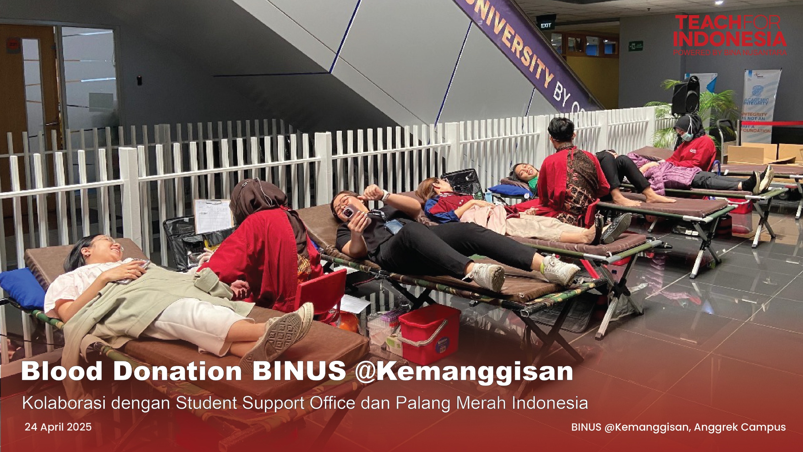 Teach For Indonesia berkolaborasi dengan Student Support Office dan Palang Merah Indonesia Kab. Tangerang kembali mengadakan Blood Donation yang diselenggarakan pada 24 April 2025. Kegiatan ini diadakan di kampus Anggrek, BINUS @Kemanggisan. Tujuan diadakan kegiatan ini adalah untuk membantu sesama yang membutuhkan, serta meningkatkan kesadaran dan kepedulian sosial.