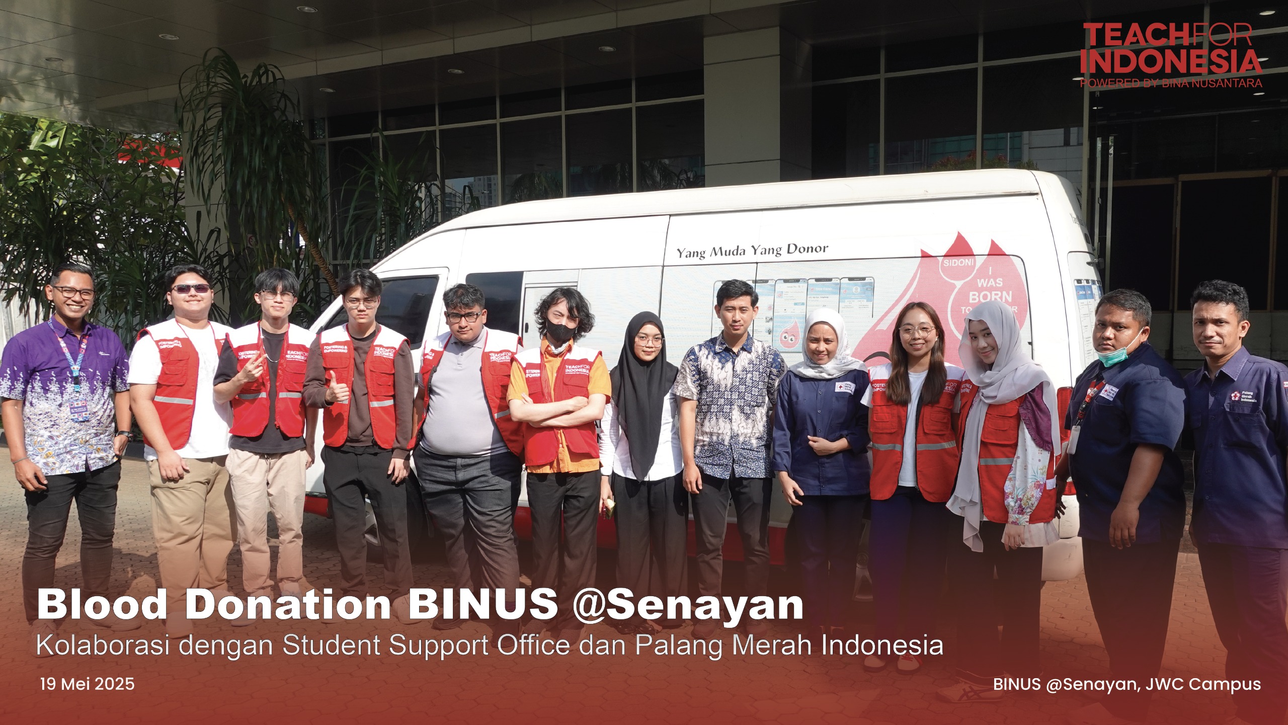 Sebagai bagian dari komitmen dalam mendukung kesehatan masyarakat dan meningkatkan kepedulian sosial di kalangan civitas akademika, Teach For Indonesia bersama dengan Student Support Office BINUS @Senayan mengadakan kegiatan Blood Donation pada 19 Mei 2025 di Kampus JWC. Kegiatan ini dilaksanakan bekerja sama dengan Palang Merah Indonesia (PMI) Kab. Tangerang, serta melibatkan partisipasi aktif mahasiswa, dosen, dan staf sebagai pendonor maupun relawan.