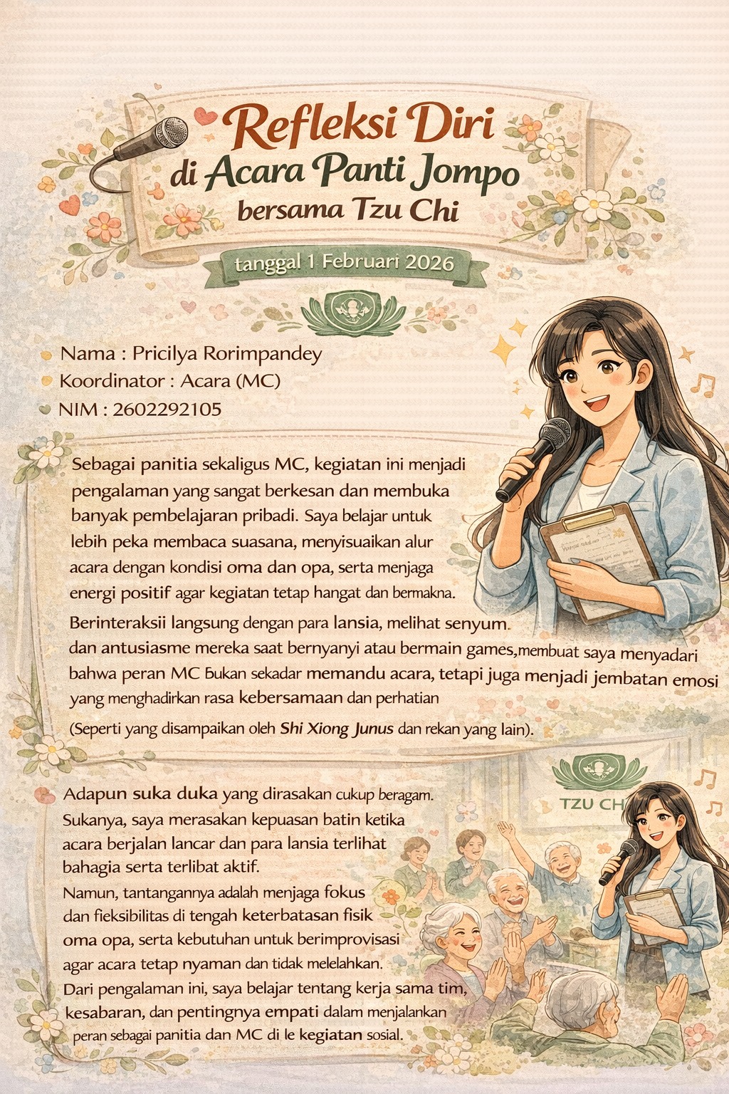 Perkenalkan aku Pricilya , Sebagai mahasiswa Business Management, biasanya aku berkutat dengan strategi dan perencanaan. Tapi tanggal 1 Februari kemarin, saat bertugas jadi MC di acara Tzu Chi bareng Oma dan Opa, aku belajar sesuatu yang nggak ada di buku kuliah.